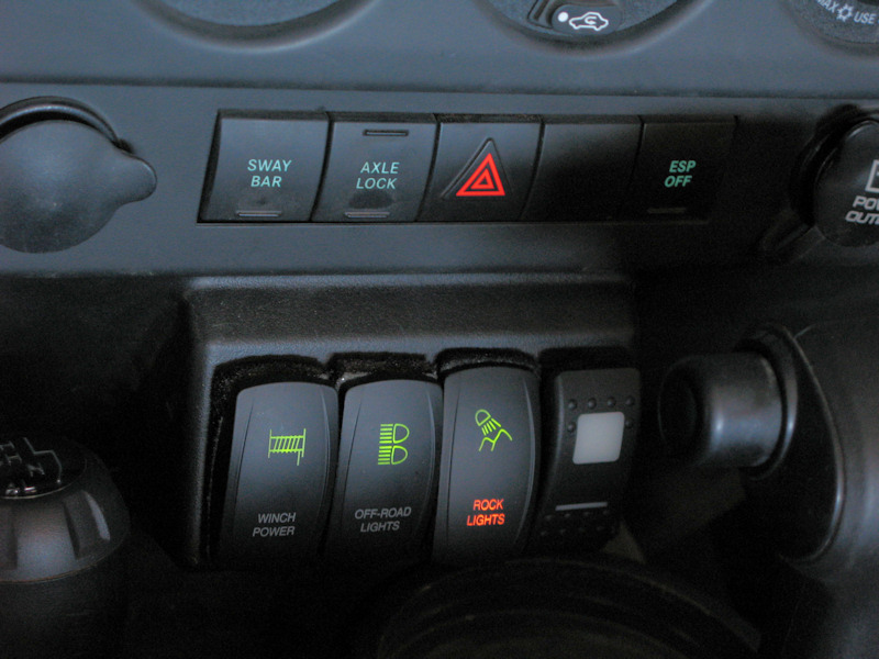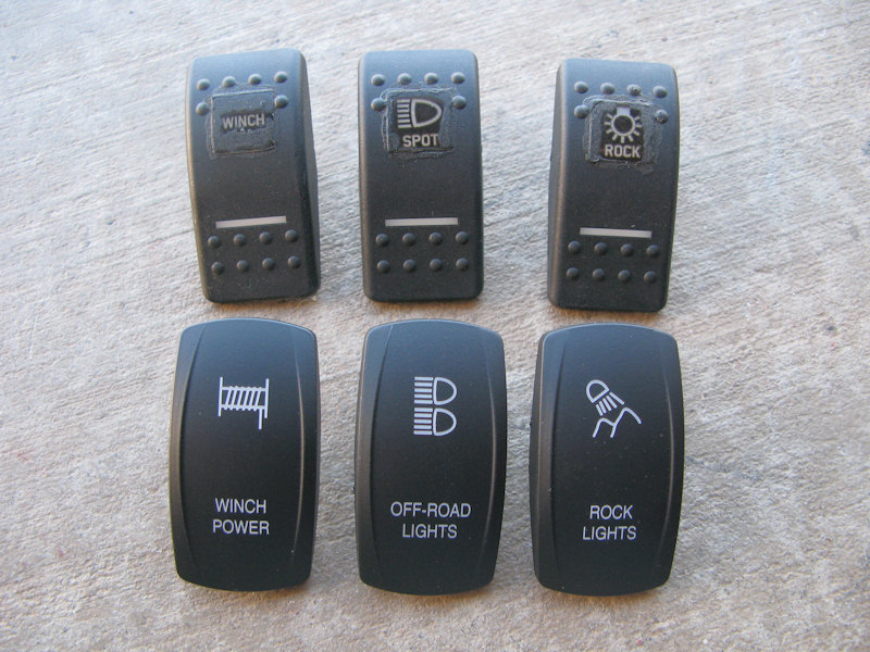 Switch Modification:I purchased Carling Contura II Rocker Switches - Model V1D2GHNB-AAC00-000. They have an LED that is lit when the dash is on and another LED when the switch is on. For some reason the rocker on the switch is not sealed so the light from the LEDs leak out, and dist and debris can leak in. You can see the gap in the switch on it's side in the bottom of the picture: