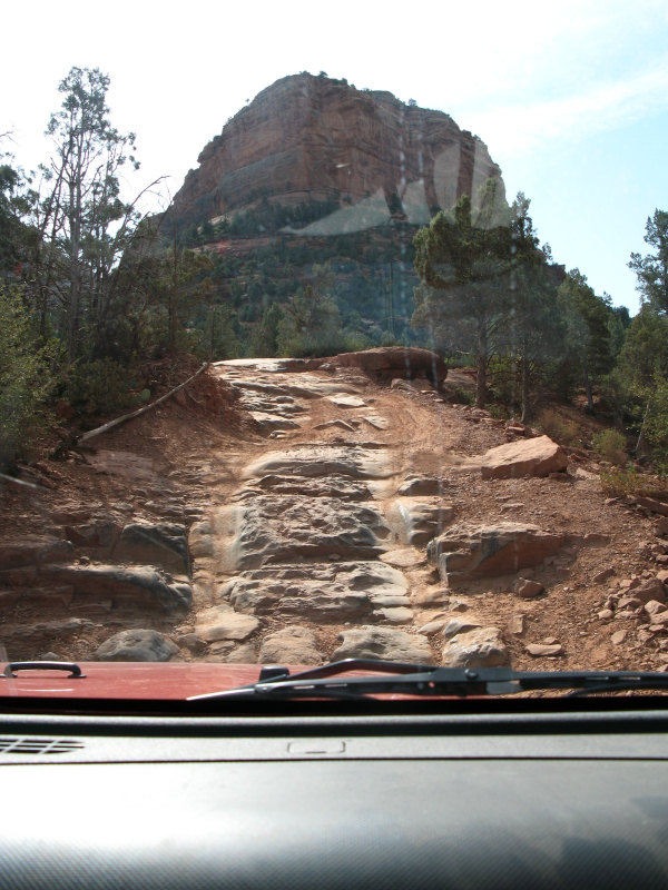 The Trail:Broken Arrow starts with a man made obstacle, which if you don't want to attempt then park your vehicle and walk the trail. There are a number of rocks to climb on and lockers are helpful but not required. The most difficult portion of the trail leads down the Steps. The "normal" route goes from parking lot, up Princess Rock (a number of cracks to play in here), down to Submarine Rock, up to Chicken Point, back down to Mushroom Rock and the Slide, and finally to the Steps. Many portions of the trail are not wide enough to support two Jeeps, so you may have to back-up to a turn out to let another vehicle drive past in the other direction. Rating:3.0 Runs:Date: 9/19/2008Suspension: TeraFlex 2.5" Spring Lift, stock tiresPhotos:In a crack at Princess Rock: