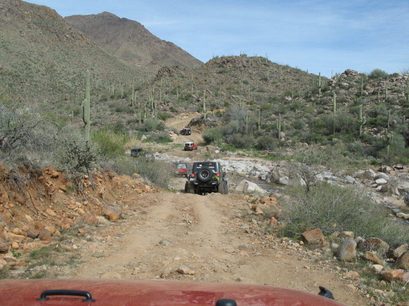 The Trail:We joined the Central Arizona Jeepers on a ride to Cooks Ranch via Table Mesa Road and FR37. The trail was a little rougher than planned, and there were two Jeep that had mechanical problems, but they got out OK and we made it to the ranch. Rating:1.5 when dry, 2.0 when wet and muddy. Runs:Date: 2/15/2009Suspension: TeraFlex 2.5" Spring Lift, stock tiresPhotos:Airing down and talking: