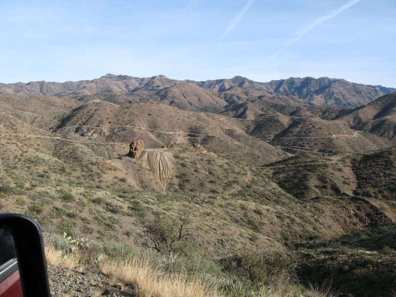 The Trail:We entered this area when we were out Benchmarking. There are old workings scattered throughout the area and unmarked roads crisscross the mountains. We tried to stick to the trails on our GPSr and maps, but still ran into some main roads that are now blocked by locked gates. The trails are primarily dirt roads that are rough and rocky in some stretches. Rating:2.0 Runs:Date: 10/30/2009Suspension: TeraFlex 2.5" Spring Lift, BFG 35x12.50x17Photos:A view from the access road heading into the area:
