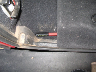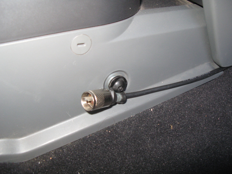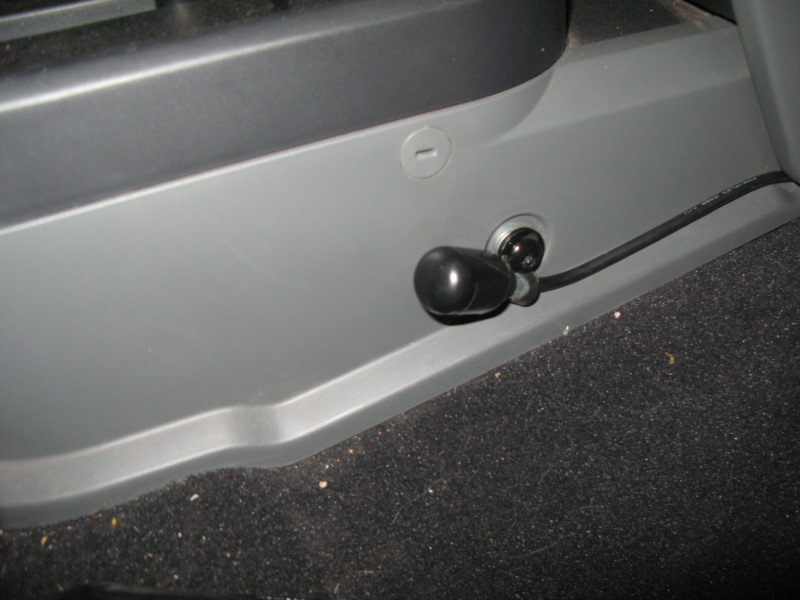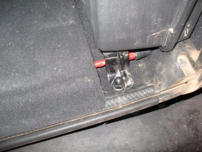 Run the coax under the carpet up and under the dash to the passenger side, and bring it forward to just past the screw on the console. Use another rubber clamp to hold the wire in place: