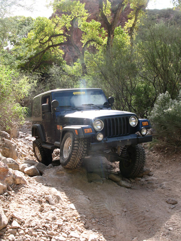 Heading back out through the rock garden. Here's the video. Hit the bolder correctly on the way out. On the way back just past the rock garden you have to navigate down a small creek. Near the end you can hear us adding some more Arizona pin striping from the bush. Here's the video. We left through Box Canyon. Date: 4/26/2009Suspension: TeraFlex 2.5" Spring Lift, stock wheels and tiresPhotos:Vultures waiting for us at the cabins:
